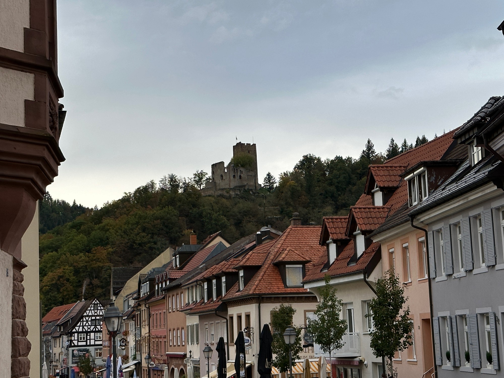 Buildings in Waldkirch below the ruined castle Kastelburg.