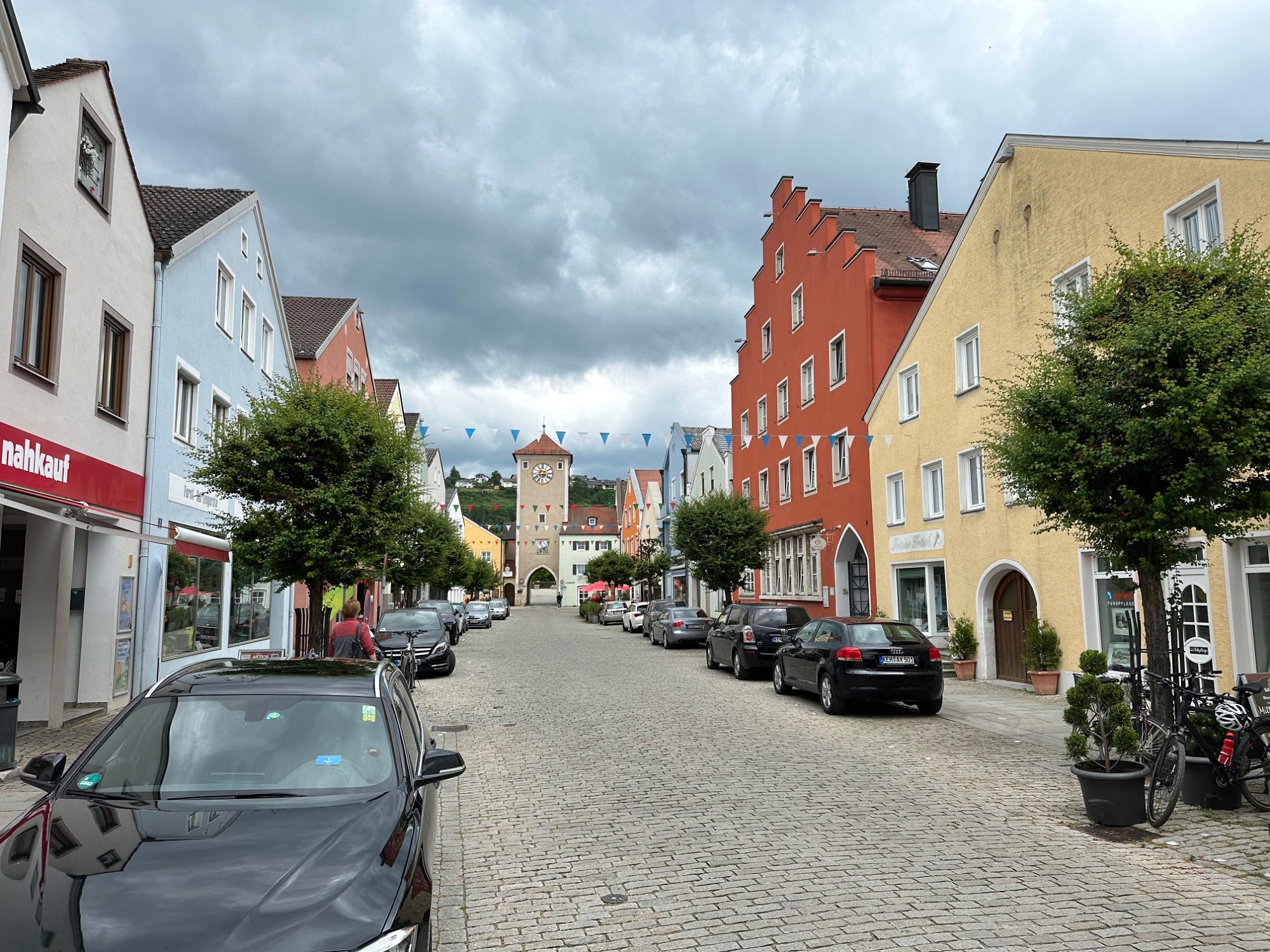 The street Altmühlstraße in Kehlheim with the Altmühltor town tower at its end.