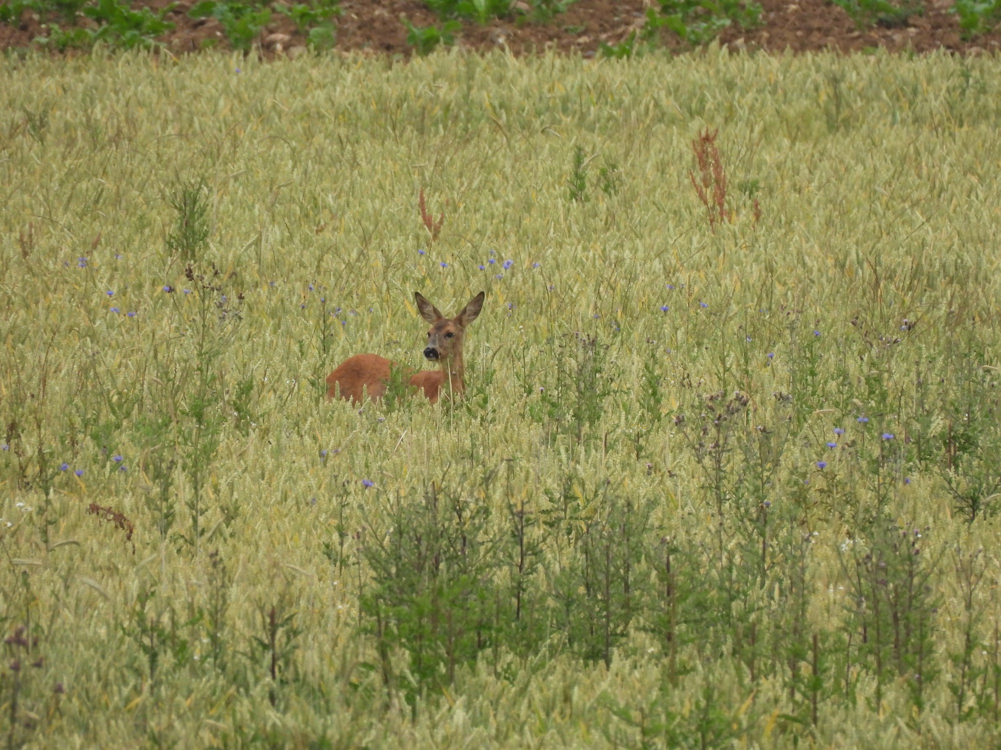 A roe deer (Capreolus capreolus) in a grain field. Remarkably are the many weeds on this field: it is a sign of an extensive cultivation.