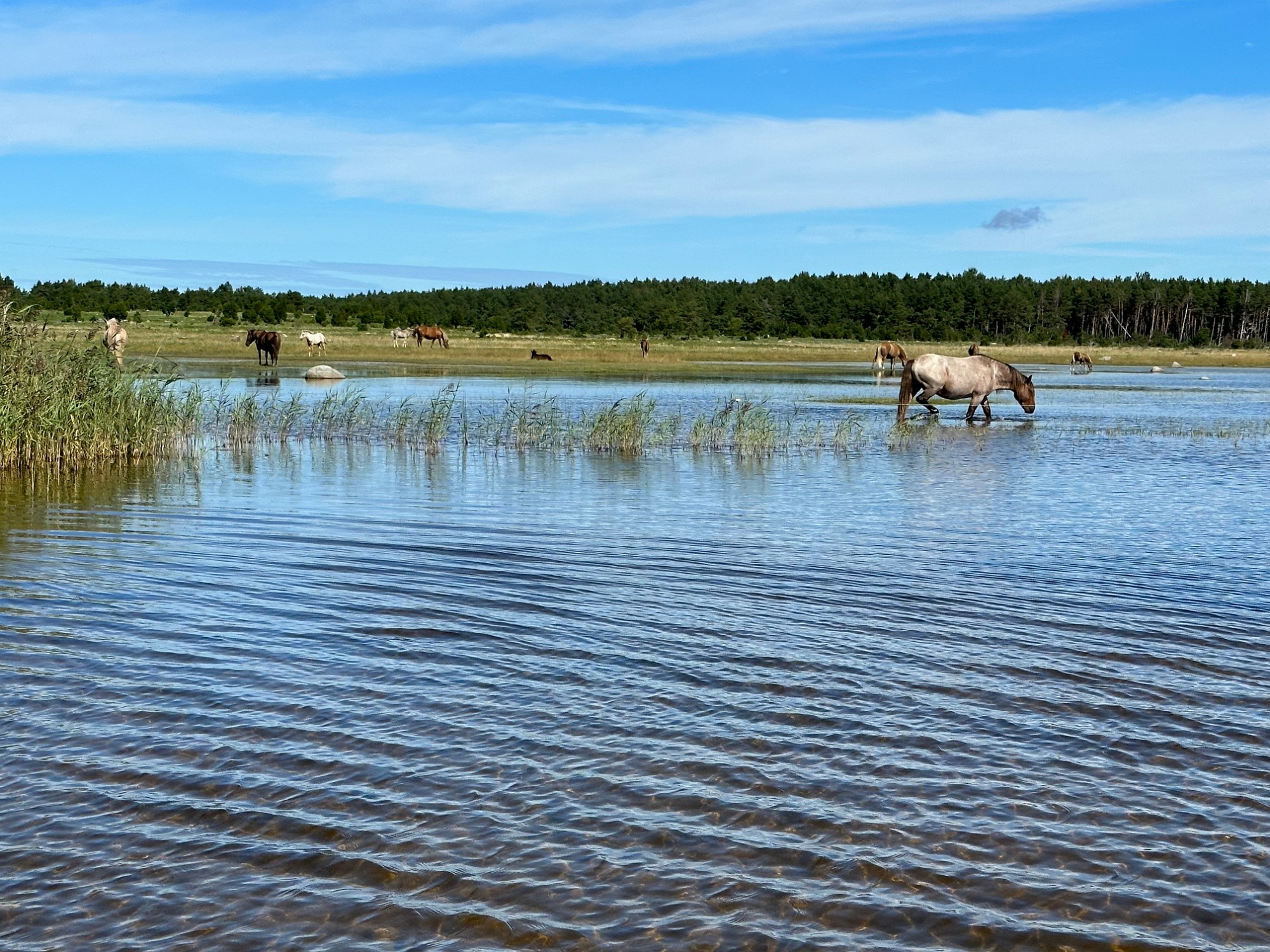 Horses grazing in the shallow sea at the island Vilsandi, the westernmost populated island in Estonia.