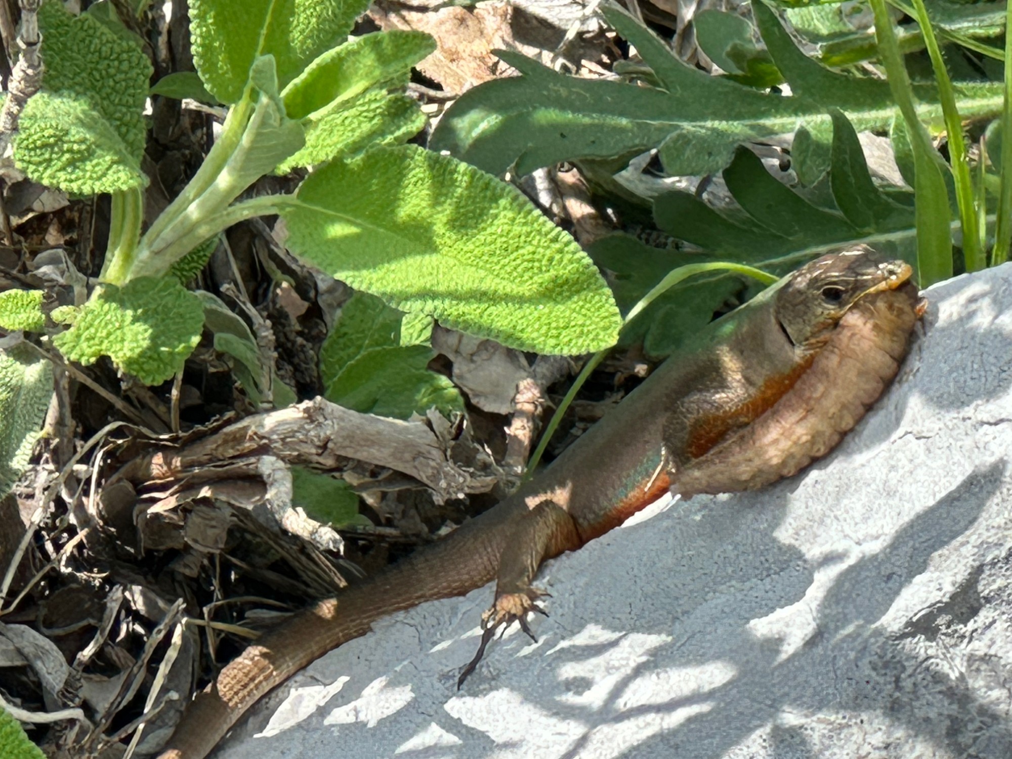 The blue-throated keeled lizard (Algyroides nigropunctatus) caught a fat caterpillar.