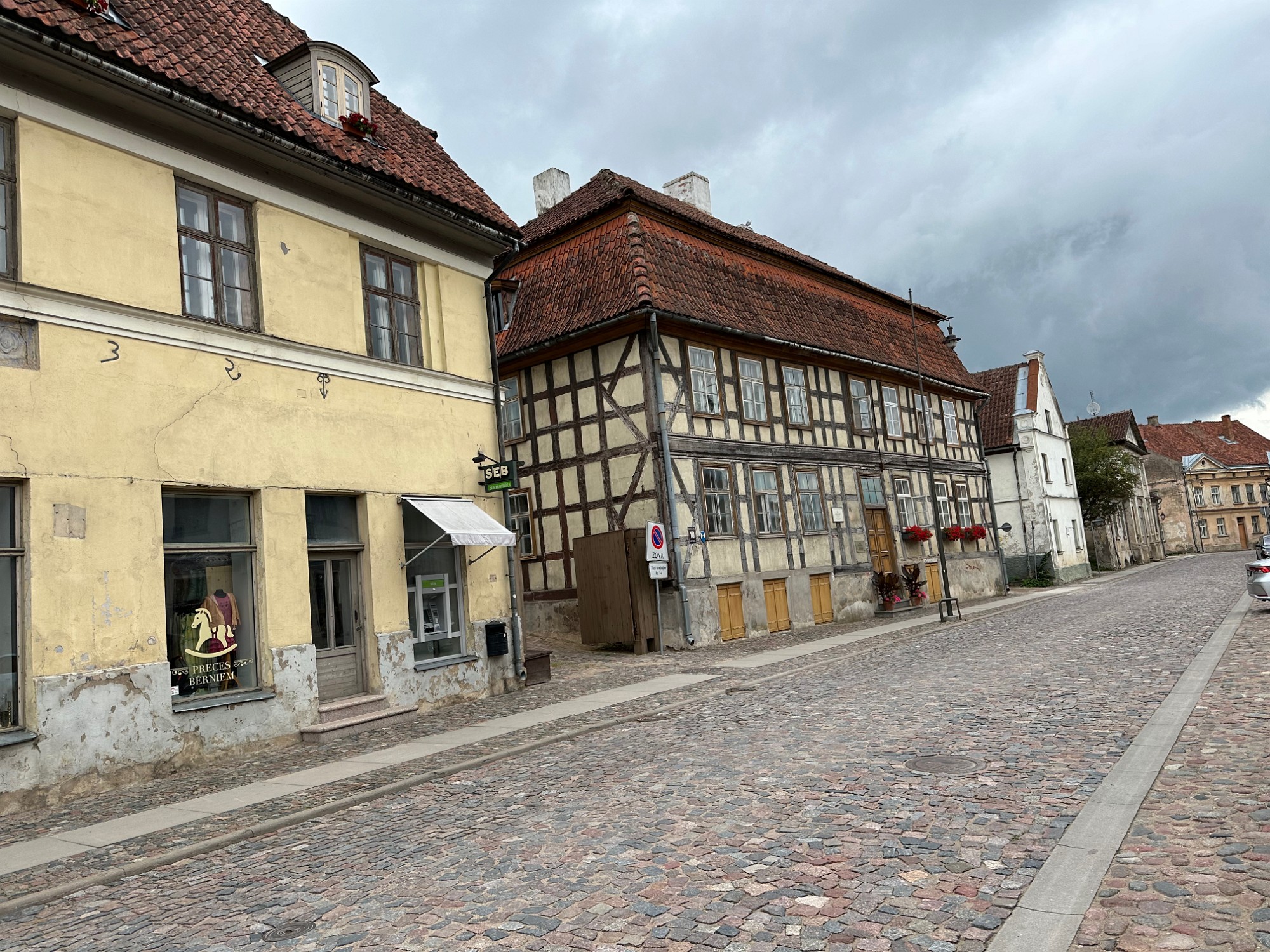 Liepājas street is a pedestrian street with several 17th–20th-century buildings, interesting doors and special windows. The timber framed building is a former Duke's Pharmacy.