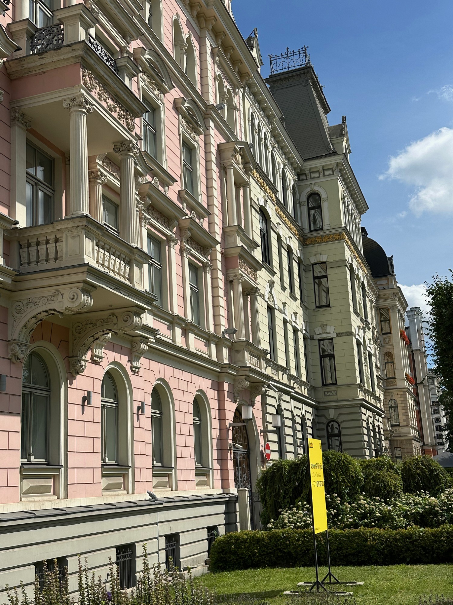Some Art Nouveau buildings have small gardens in front of them.