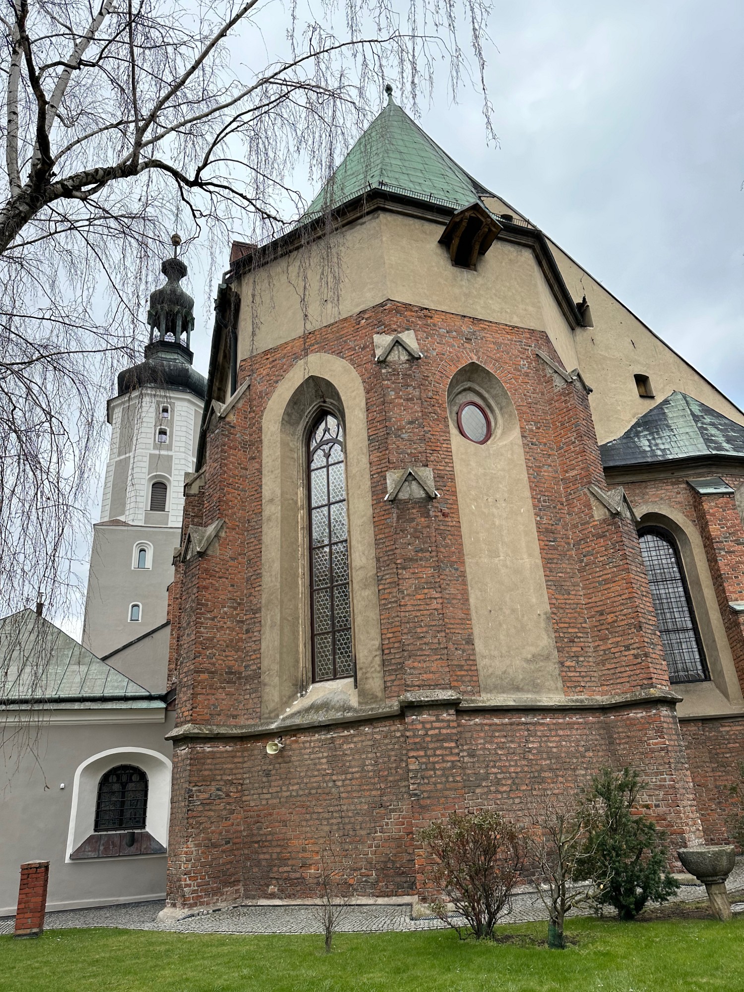 The not renovated part of the parish church contrasts with the renovated one.